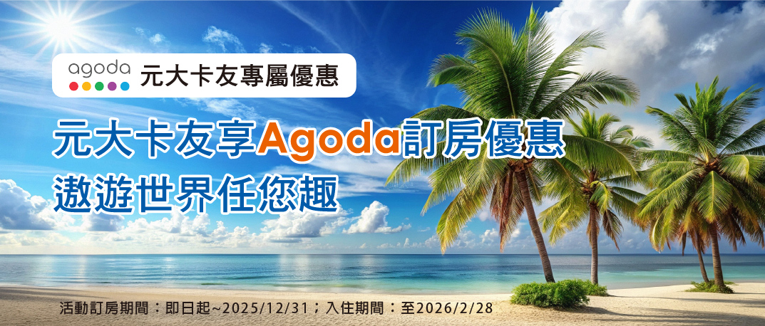 活動內容:於活動訂房期間內,透過元大銀行卡友專屬活動網頁連結至 Agoda,並預先以本行信用卡支付全額款項,即可享訂房7%折扣優惠,每筆訂單折扣上限為USD$30。