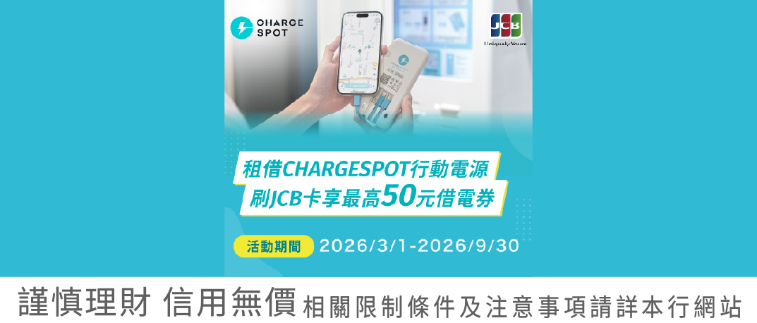 元大JCB信用卡享租借CHARGESPOT行動電源最高50元借電券優惠