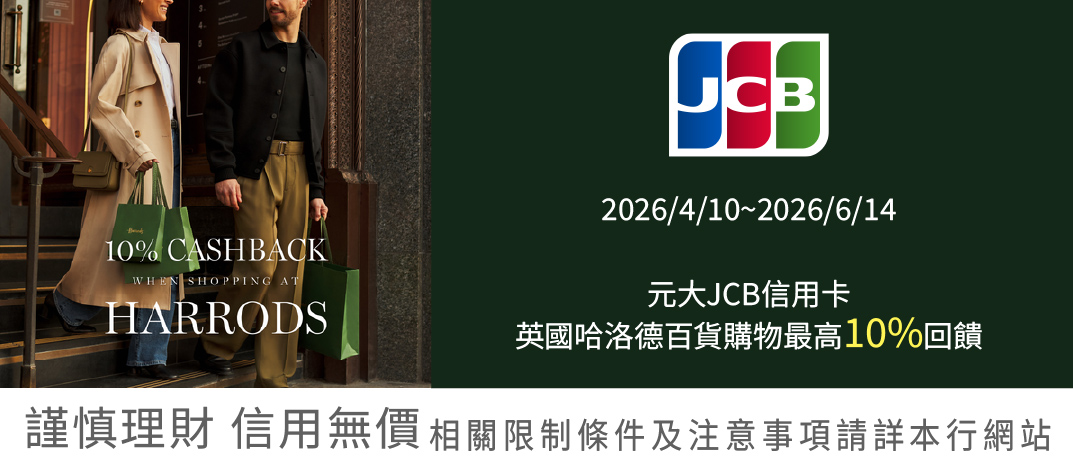 1.本活動適用對象為元大銀行JCB信用卡持卡人,持JCB實體信用卡於英國Harrods哈洛德百貨以英鎊結算並支付成功之消費方為回饋對象。