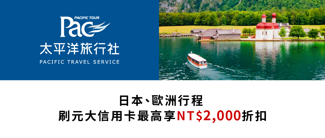活動內容:於活動期間內,至【太平洋旅行社官網】購買指定行程,刷元大信用卡享折扣優惠: