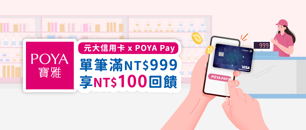 活動內容:活動期間內持元大信用卡綁定POYA Pay,單筆消費或儲值滿NT$999享NT$100刷卡金回饋(每月限量200名,需當月登錄)。