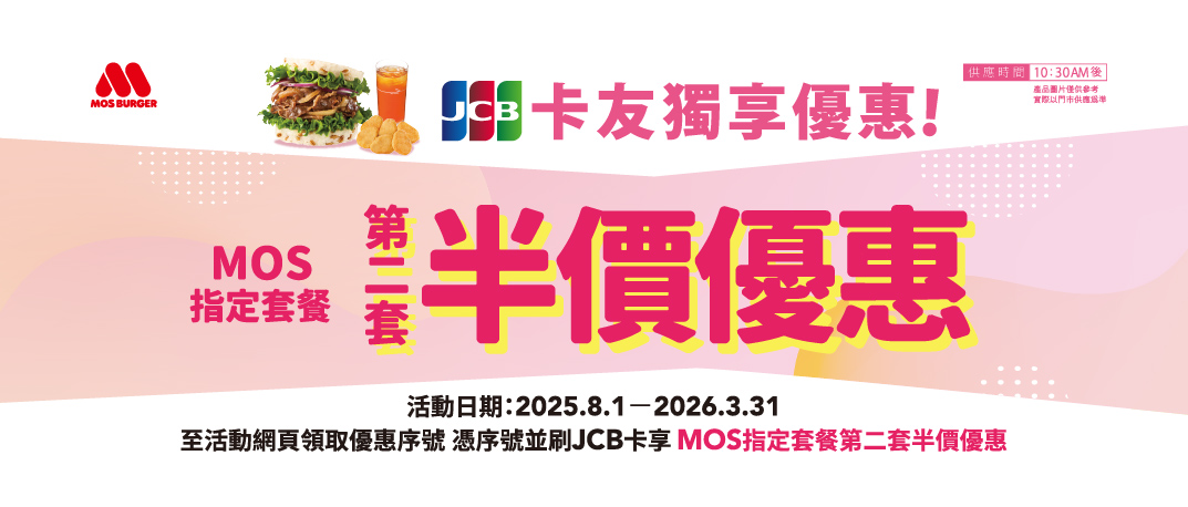 活動內容:持元大JCB信用卡享摩斯漢堡指定套餐第二套半價優惠