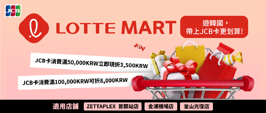 釜山光復店活動期間內,於韓國指定樂天超市實體門市服務台出示元大JCB信用卡+護照,即可領取一張優惠券。每張優惠券上有兩種折扣條碼: