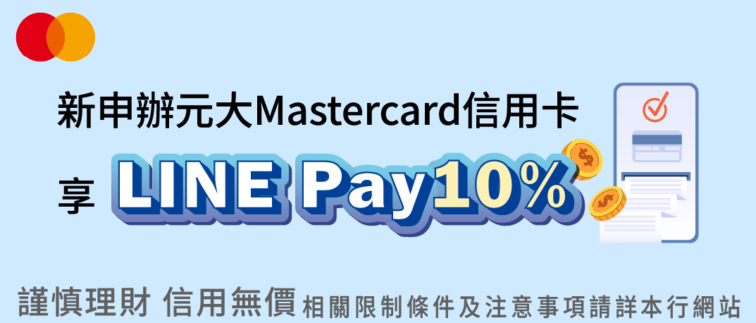 活動期間內申辦元大銀行任一Mastercard信用卡正卡(不限新/舊戶、不含補/換發卡),自核卡日起算90天內,以申辦核發之信用卡綁定LINE Pay支付,享國內一般消費筆筆加碼「10%刷卡金回饋」。