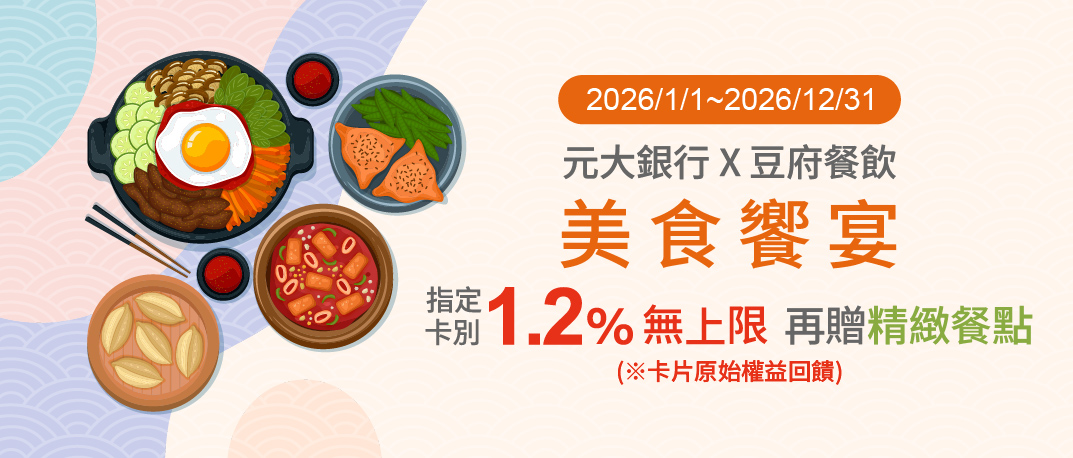 活動期間至豆府餐飲旗下指定品牌門市用餐,刷元大銀行信用卡即可享每桌贈精緻餐點乙份優惠。
