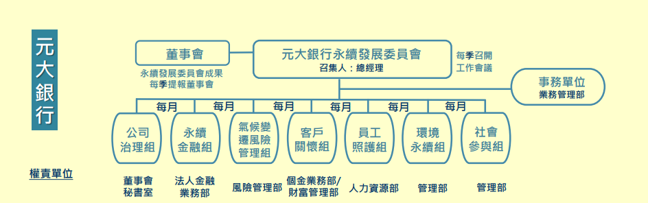 元大金融控股股份有限公司(下稱元大金控)於董事會下設置永續發展委員會,成員為董事,並由董事長擔任召集人,每年至少召開二次會議,負責企業永續發展年度計畫、策略方向審定,各項永續方案督導與成效檢討等,並定期向董事會報告。
