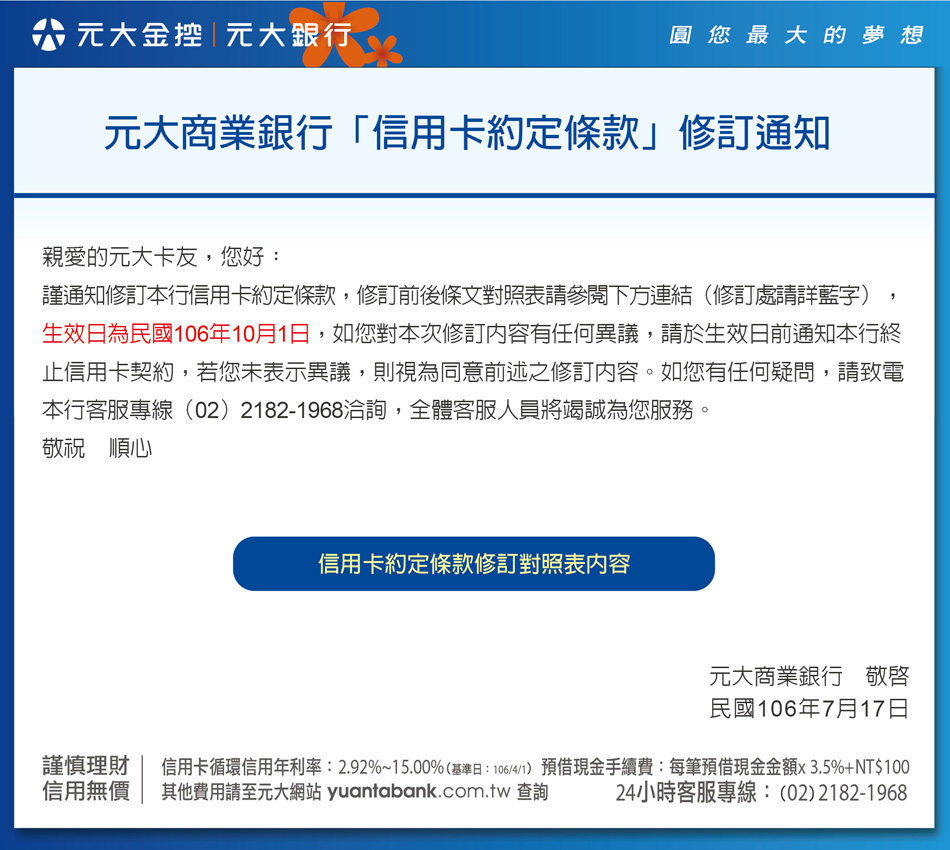 信用卡約定條款修訂暨年費方案調整內容