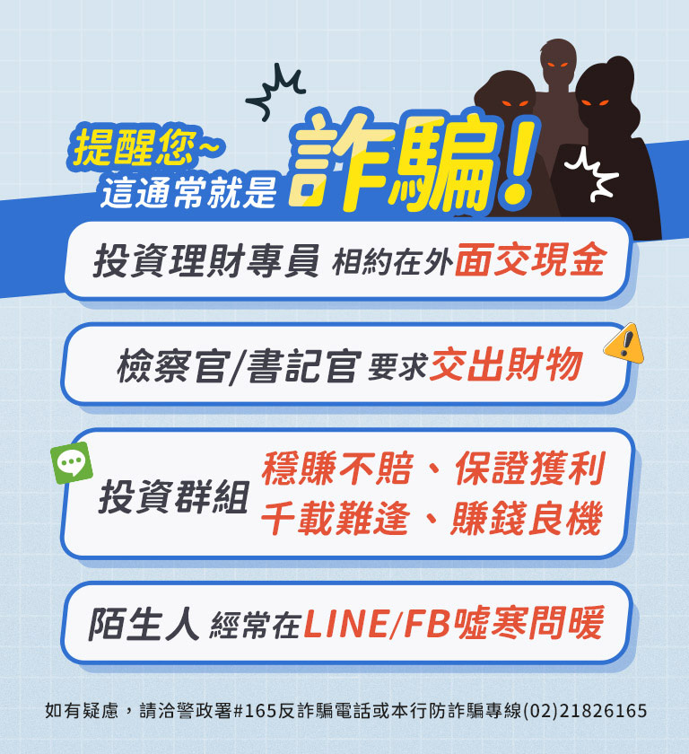 遭遇詐騙洽詢相關事宜,可撥打內政部警政署「165」反詐騙諮詢專線,進行諮詢、檢舉或報案。