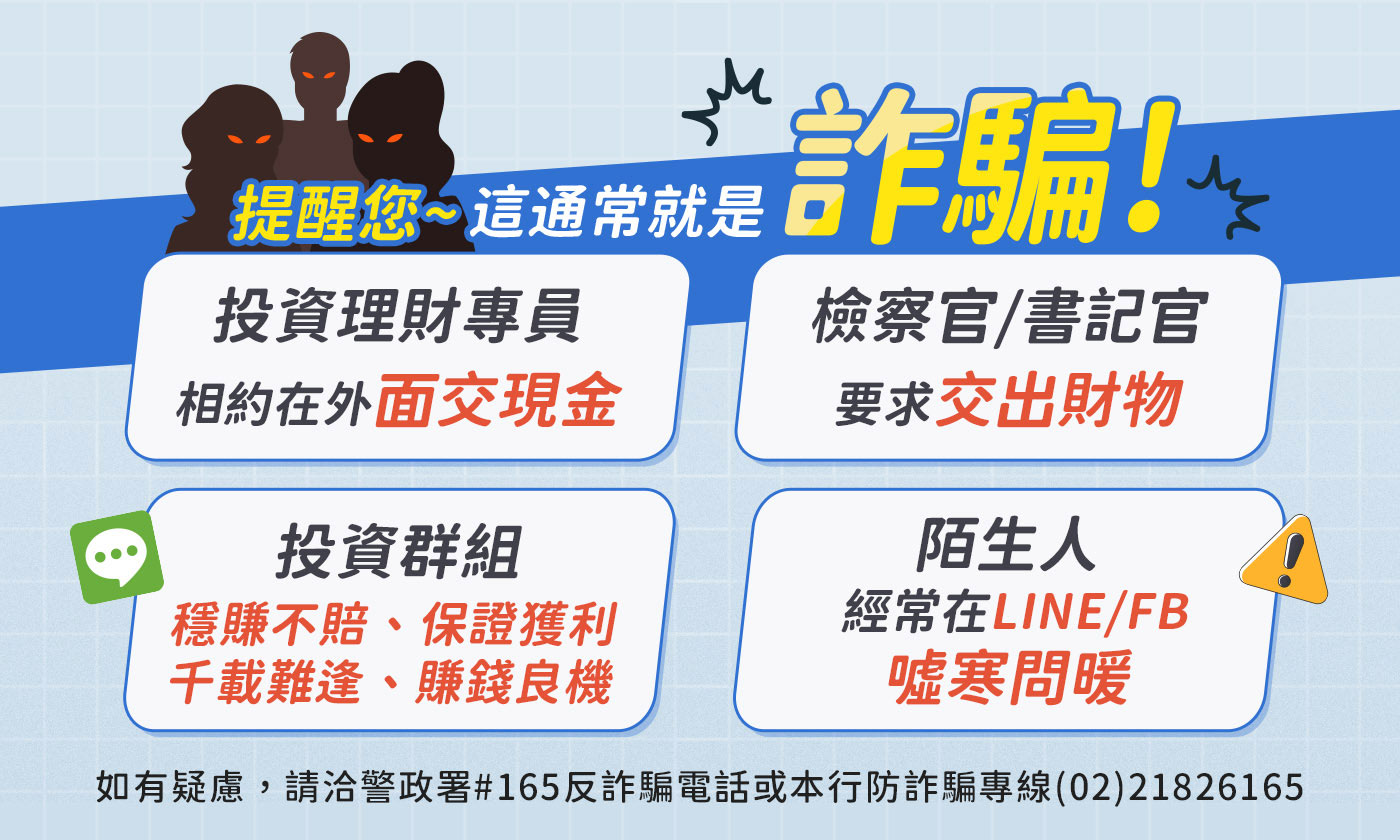 本行客戶如有遭詐騙疑慮或可疑交易,可撥打元大銀行防詐諮詢專線(02)2182-6165,由專人24小時提供即時諮詢與協助,即時守護客戶的財產安全。
