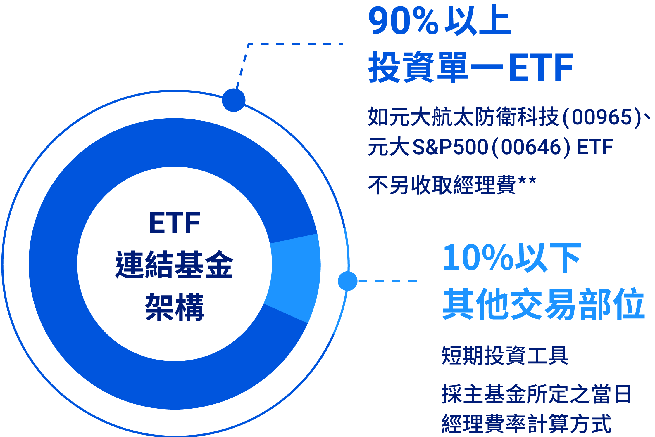 【元大海外股票ETF連結傘型基金】各子基金的運用限制、投資風險、收取經理費與反稀釋費用之釋例及投資人應直接或間接負擔之相關費用、紛爭處理及申訴管道等皆已揭露於基金公開說明書。投資人申購的是經理公司所募集發行之各子基金(即元大全球航太與防衛科技ETF連結證券投資信託基金及元大標普500 ETF 連結證券投資信託基金)受益憑證,而非申購在臺灣證券交易所掛牌交易之元大全球航太與防衛科技ETF證券投資信託基金(00965)或元大標普500 ETF證券投資信託基金(00646)等二檔ETF。臺灣證券交易所及前揭二檔ETF的指數提供者並無以任何方式贊助、背書、認可、銷售、宣傳或推廣各子基金之募集發行。應留意各子基金之基本投資方針及特性未必適合每一個人投資,投資人申購前應依本身投資目標、風險承受度等條件,進行審慎評估,且1. 各子基金投資於單一連結的主基金應達基金淨資產價值90%以上,故投資風險無法透過投資組合進行分散。2. 各子基金雖以連結主基金績效表現為投資目標,惟仍可能因以下因素影響,使各子基金績效與所連結主基金績效略有差異:(1)基金應負擔之費用:各子基金交易成本及應負擔費用例如:經理費、保管費等將自該子基金資產中扣除;(2)投資主基金之比重未達淨資產價值100%:為保留現金流動部位因應申贖,各子基金投資主基金比重未必達淨資產價值100%;(3)期貨交易:各子基金將進行期貨交易使基金整體曝險儘可能貼近基金規模100%。因期貨的價格發現功能使其對市場信息、多空走勢之價格反應可能不同有價證券標的,故各子基金將同時承受主基金及期貨標的對市場信息反應不一所產生的價格落差等因素。3. 各子基金投資於主基金受益憑證之部位,經理公司將不收取經理費,惟保管費仍依各子基金規模計收。受益人應負擔之費用包括各子基金及所投資主基金之相關費用。各子基金所投資有價證券價格漲跌及其他因素之波動將影響基金淨資產價值之增減,且最大可能損失達原始投資金額。各子基金自成立之日起三十日後,(1)受益人得依最新公開說明書之規定,以書面、電子資料或其他約定方式向經理公司或其委任之基金銷售機構提出買回之請求;(2)各子基金任一投資人任一營業日之申購、買回或轉申購金額,分別合計達各子基金淨資產價值一定比例時,即收取反稀釋費用,且得自該次申購受益憑證發行價額/該次買回受益權單位價金中扣除,反稀釋費用歸入各子基金資產。(反稀釋費用相關規定實施日期將另行公告)