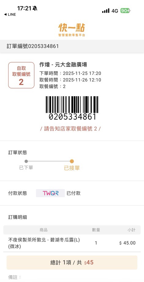 在作燴Line官方帳號點完餐後,點選線上付款並在付款方式選擇TWQR。