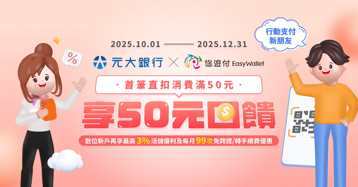 - 數位存款帳戶新戶以元大銀行存款帳戶綁定悠遊付,進行直接扣款消費交易,筆筆享50%回饋(回饋總金額為20萬元,每人總回饋上限300元,送完即止)