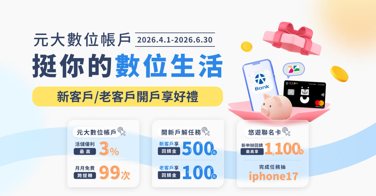 數位帳戶新戶,申辦元大悠遊聯名卡且完成任一筆刷卡消費享500元回饋金