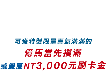 - 專案所回饋贈品「億馬當先撲滿」:115年4月30日為最後領取日,顏色隨機無法指定,以符合專案客戶報名時間排序致贈,數量有限,送完為止,元大銀行保有更換等值刷卡金替代之權利,元大銀行非贈品製造者,相關產品責任,悉由該贈品生產廠商負擔,與元大銀行無涉。