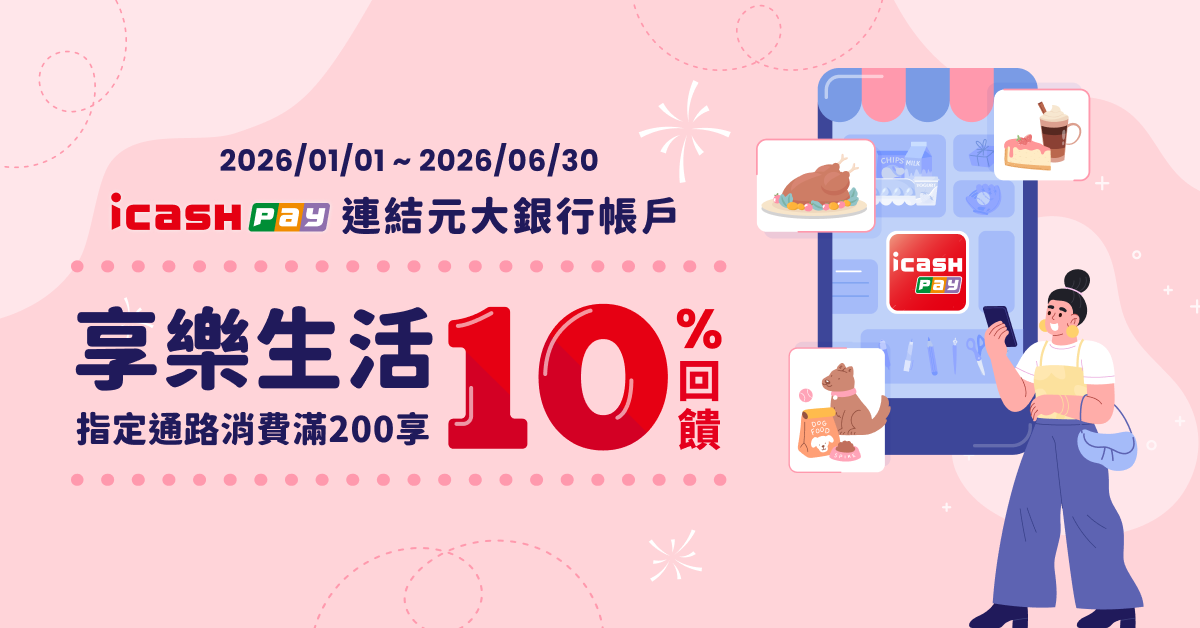 活動期間內使用icash Pay連結元大銀行存款帳戶,以直扣付款方式於指定享樂生活通路,單筆消費滿新臺幣200元享10%OPENPOINT回饋。