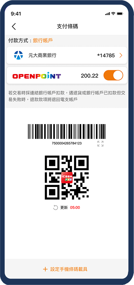 開啟【支付條碼】功能,出示條碼或QR Code予商家掃描。