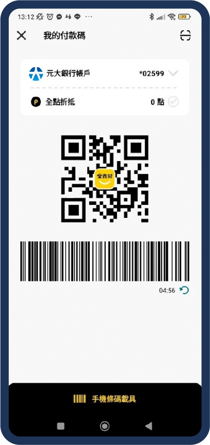 付款方式選擇已授權的「元大銀行帳戶」,並出示條碼或QR Code提供店家掃描。