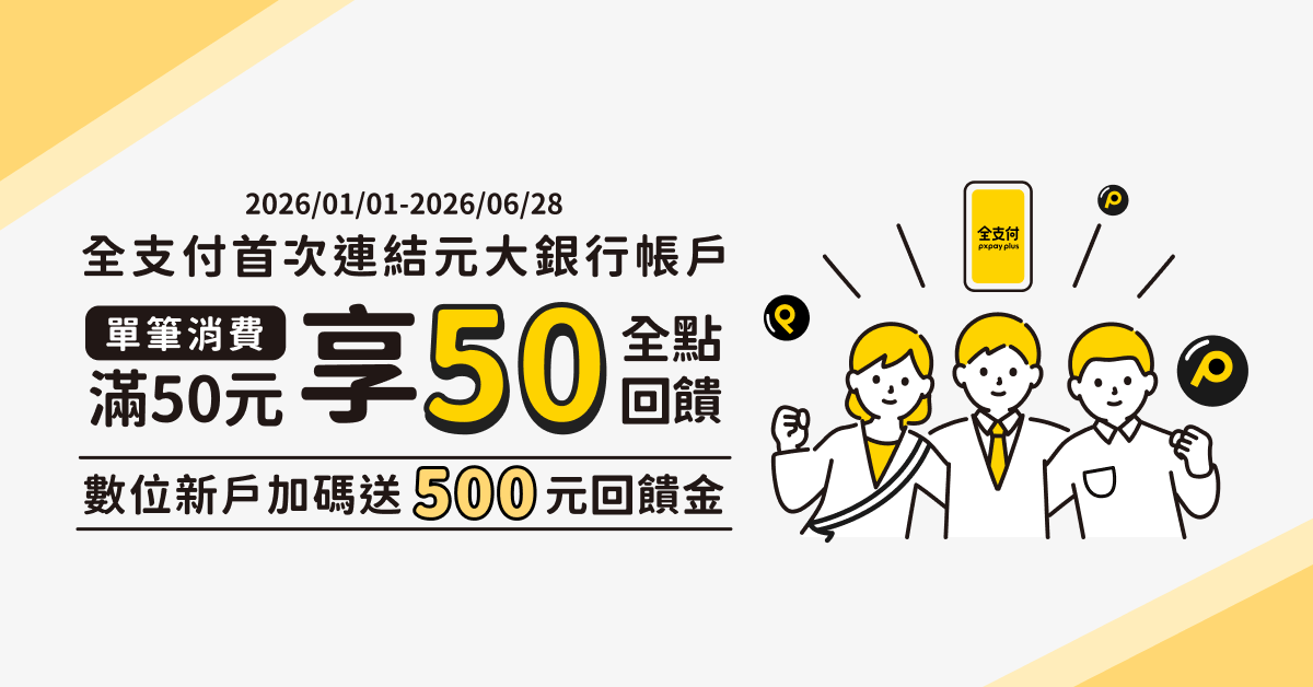 活動期間使用全支付首次連結元大銀行臺幣存款帳戶,
