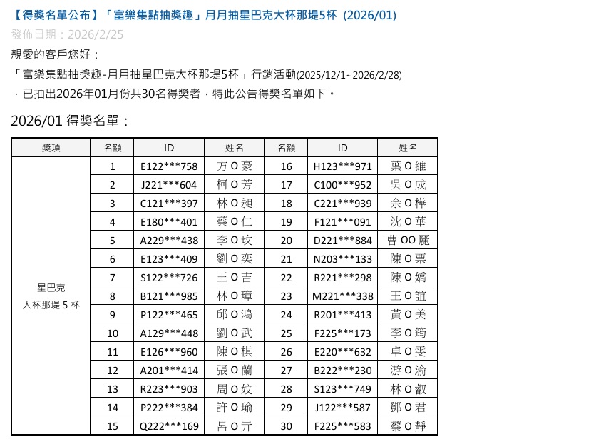 【得獎名單公布】「富樂集點抽獎趣」月月抽星巴克大杯那堤5杯 (2026_1月份)